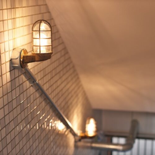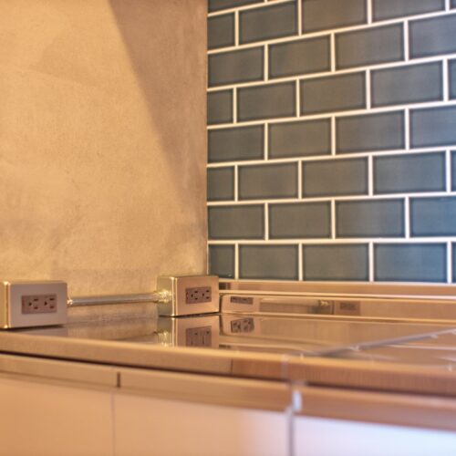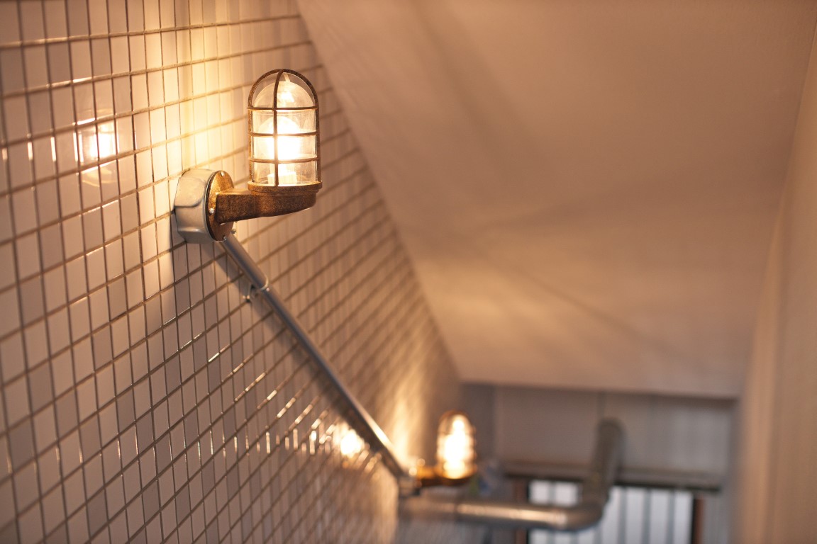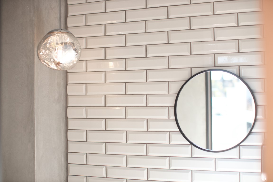 落ち着いた色味で塗装された天井や壁、タイルの質感が目を引く間仕切り壁。